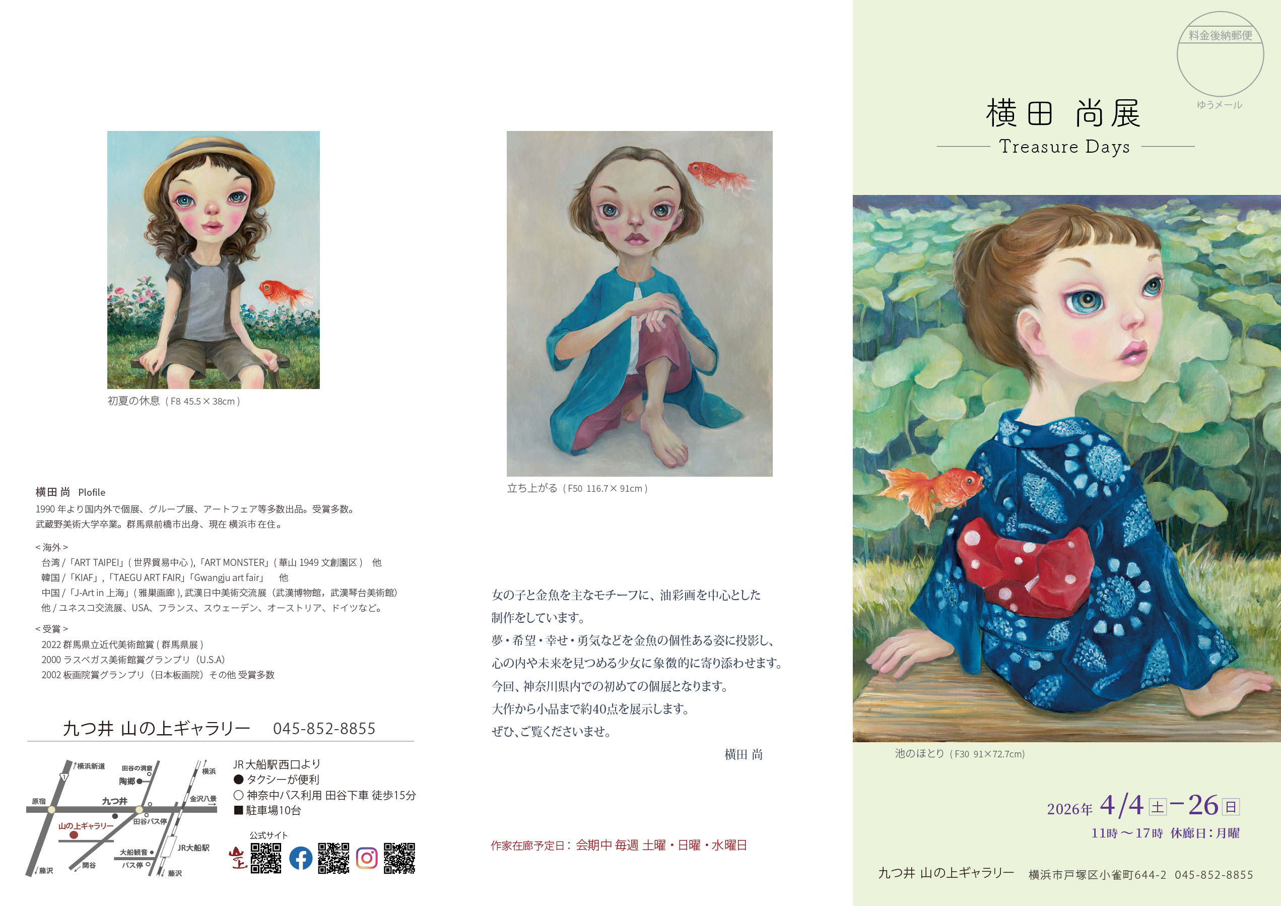 今回、神奈川県内での初めての個展となります。大作から小品まで約40点を展示します。ぜひ、ご覧くださいませ。 横田 尚